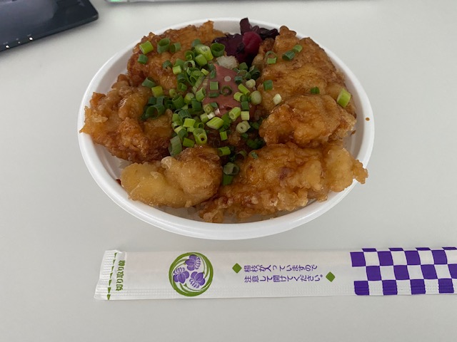 ご飯の上にとり天、たぶん胸肉の天ぷらで埋め尽くされてます。食べながら数えましたが、多分6個かな。かなりのボリュームでした。