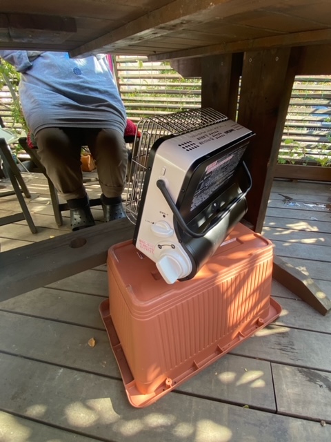 義母用には、足元にカセットコンロヒーターを仕込んだ。