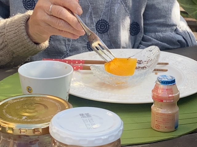 秋晴れの週末、ちょっと肌寒くなったが、ウッドデッキで朝食を取った。