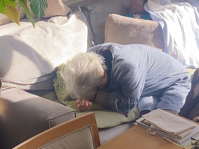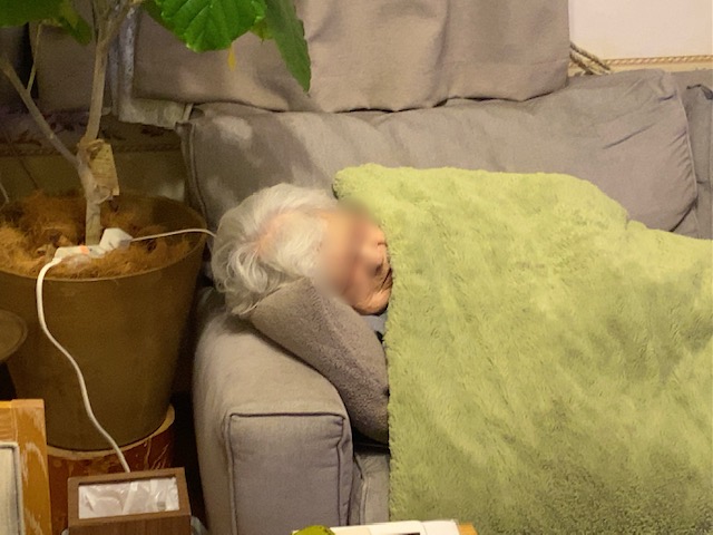 昼過ぎ、昼食の用意を始めて、ふとソファーを見ると、クッションにうつ伏している義母。